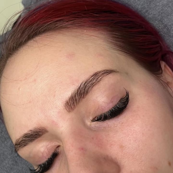 Ripsien ja kulmien värjäys pitkäkestoisella hybridivärillä sekä kulmien muotoilu pinseteillä. Hybridiväri sisältää hennaa, joten allergisille käytämme kestoväriä.